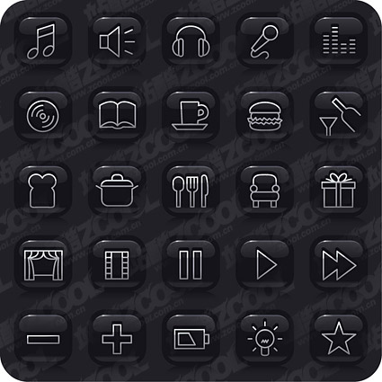 eps format, with jpg preview, the crucial words: vector icons, buttons, music, sound, headphones, microphone, line, sound waves, CD, books, beverages, cups, hamburgers, bottles, kitchen utensils, dishes, chairs, a gift, the curtain , Film, broadcast control, batteries, light bulbs, Star, Vector material